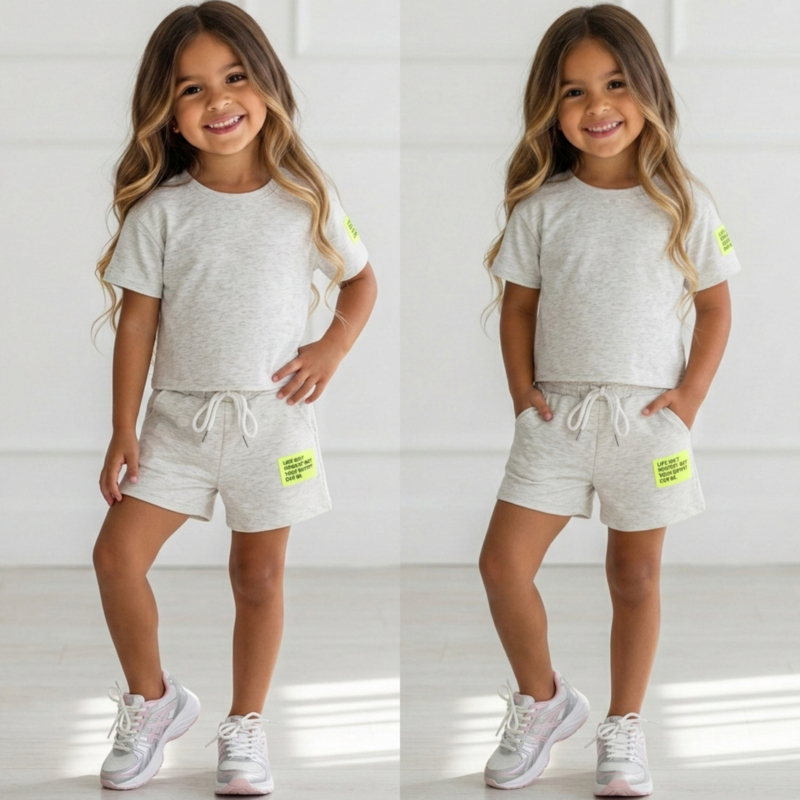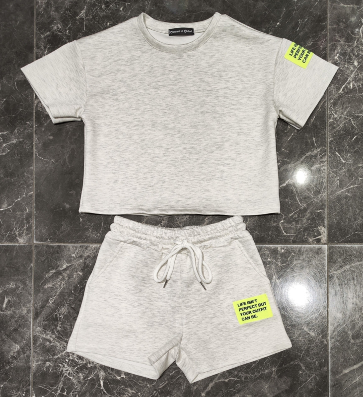 Artikelnummer: HN.26063gre ww1 OverzichtOp zoek naar een vrolijke, comfortabele én trendy zomerset? Deze grijze 2-delige sweatset voor meisjes is dé perfecte combinatie van stijl en gemak. De set bestaat uit een cropped T-shirt met korte mouwen en een bijpassende short met elastische tailleband en koordsluiting.