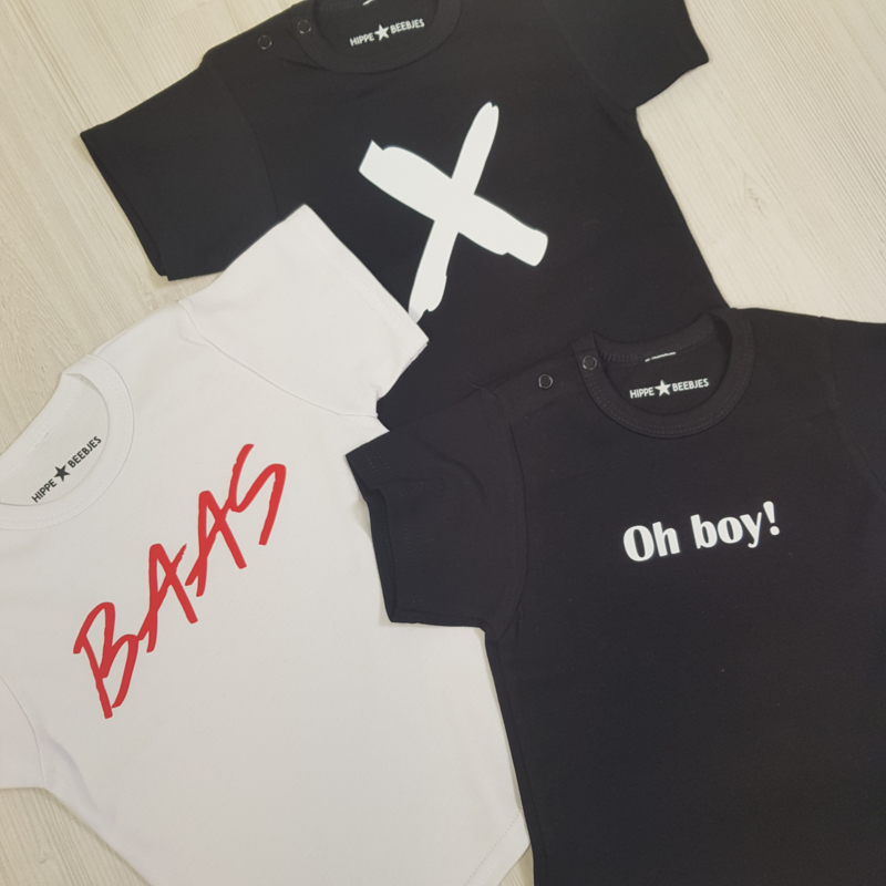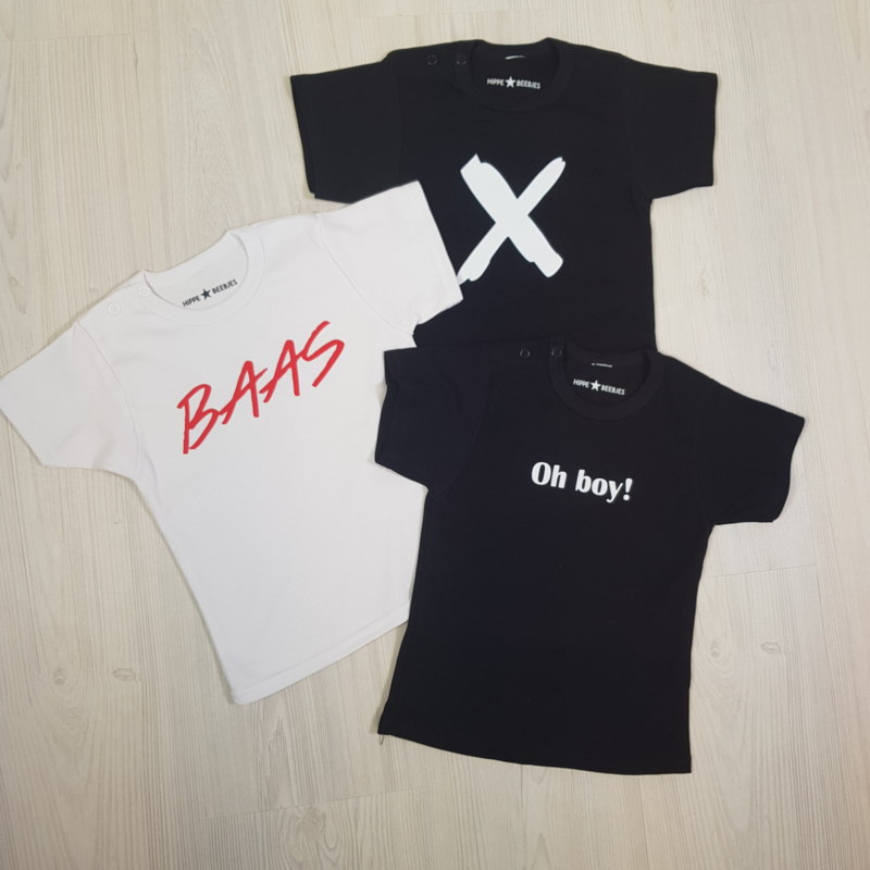 Drie shirts, twee zwarte met oh boy! en X en een witte met baas.