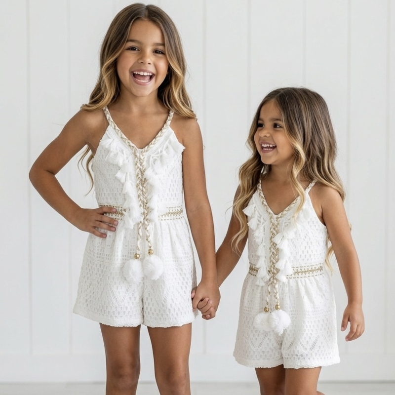Deze prachtige witte boho playsuit voor meisjes is een echte musthave voor de zomer! De verfijnde kanten stof in combinatie met de speelse kwastjes en subtiele gouden details zorgt voor een luxe en trendy uitstraling.